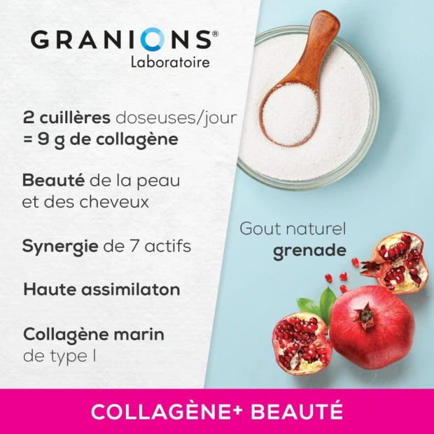 Le Laboratoire des GRANIONS a développé un complexe à base de Collagène en poudre hautement concentré et d’acide hyaluronique. L’association de la Vitamine C, puissant antioxydant et de la Biotine, qui contribue à la beauté de la peau et des cheveux, complètent la formule pour une action optimale.
