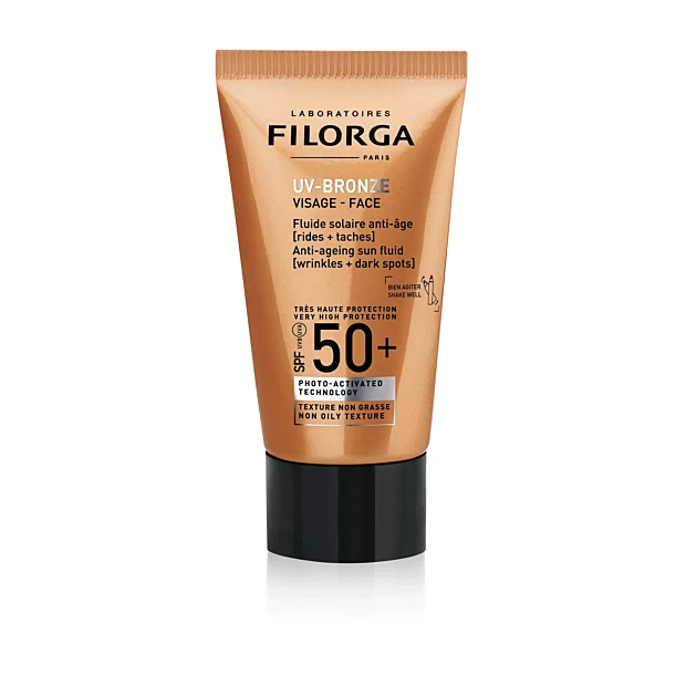 Filorga UV-Bronze Visage Fluide Solaire Anti-Âge SPF50+ 40 ml 🌞 est une très haute protection solaire pour les peaux matures, agissant contre le vieillissement et les taches.