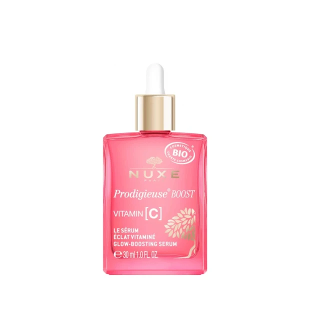 Nuxe Prodigieuse Boost Vitamin [C] Le Sérum Éclat Vitaminé Bio 30 ml est un sérum à l’efficacité anti-oxydante. Enrichi en vitamine C stabilisée, quelques gouttes suffisent pour booster l’éclat et la fraîcheur de la peau. Les traits sont lissés, comme défatigués, les premiers signes de l’âge sont estompés, la peau est repulpée.
