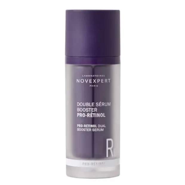 Un DOUBLE SERUM, une DOUBLE FORMULATION réunissant pour la première fois en cosmétique 3 complexes anti-âge : le Pro-Rétinol, le Bakuchiol (Rétinol like) et 2 acides de fruits doux (AHA & PHA).