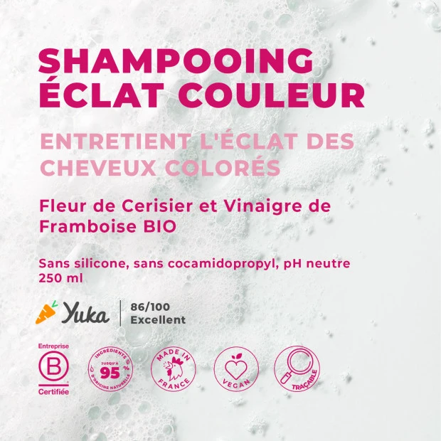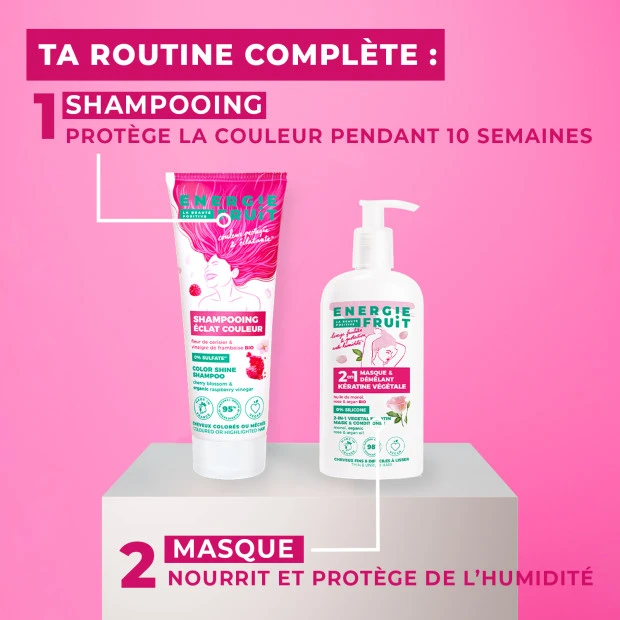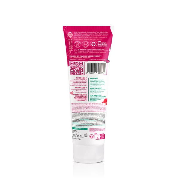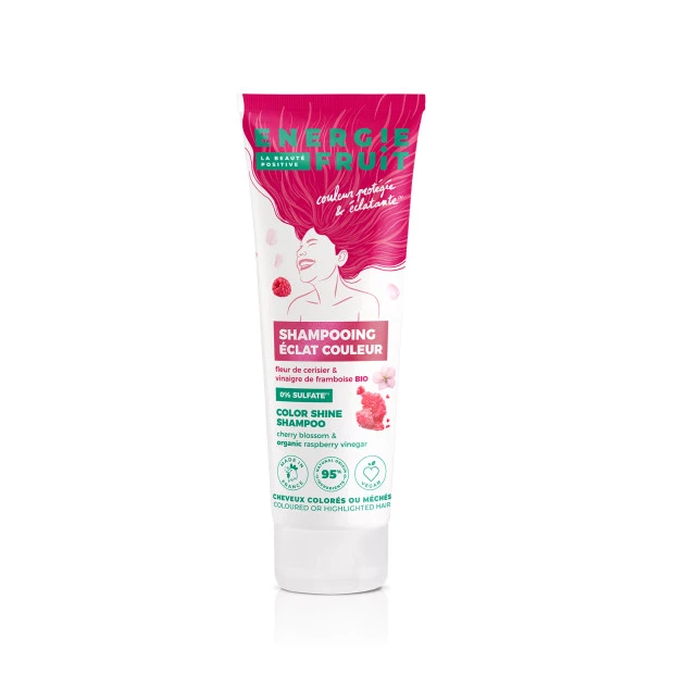 Energie Fruit Shampoing Éclat Couleur 250 ml est un soin capillaire spécialement élaboré pour les cheveux colorés ou méchés. Sa formule à base de vinaigre de framboise Bio lutte efficacement contre les résidus de calcaire pour donner une brillance éclatante. Couplée aux actifs antioxydants de la fleur de cerisier, les cheveux sont nourris et la couleur ravivée, protégée pendant 10 semaines et délicatement parfumée. Sans sulfate. 95% des ingrédients sont d’origine naturelle. Vegan. Fabriqué en France.