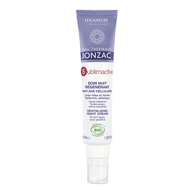 Enrichi en eau thermale de Jonzac anti-âge et en pro-physial®, reconnu pour stimuler la synthèse de pro-collagène(1), architecte de la peau garantissant sa fermeté, le soin nuit régénérant anti-âge cellulaire(1) Sublimactive® lisse les rides et ridules et raffermit durablement la peau.